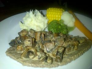 INGREDIENTS: handful of fresh thyme, beef fillets (I used schnitzel fillets but they weren’t tender enough, I think I’d just go for some nice pieces of steak next time), olive oil, 500g swiss brown mushrooms chopped, sea salt, 2 french shallots finely chopped, 1 clove garlic peeled and finely chopped, 1 wineglass Marsala, 4 tablespoons creme fraiche (I used lactose-free cream).