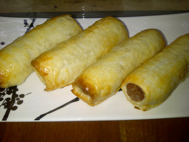 INGREDIENTS: Tray of chevap skin-less sausages (Woolies and Coles stock them); three sheets of puff pastry; beaten egg.