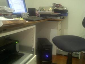 Much as I appreciate the slim, sexy iPad Husband gave me for Christmas, I’m a big, fat hard drive (and monitor) girl at heart. My hard drive isn’tsmarter trot asmy iPad. See, this is what I’m talking about. That was supposed to say “isn’t as smart as my iPad”, but my iPad assumes what I’m trying to type. It is invariably wrong, very annoying and usually nonsensical. So, in many ways, my iPad is quite stupid. My computer lumbers along and lets me type what I want. It doesn’t interfere. It also has a mouse. I love a mouse. I can move my mouse around on my screen and click things. Upload photos to my blog and other useful stuff. I’ve been bereft the past few days without my hard drive. I insisted Husband get me a new one yesterday, despite him wanting to spend endless hours trying to rescue the dead one. I couldn’t take it anymore. All that lazing around in bed with the iPad, footling on my Domain app, refreshing my blog stats every five seconds, checking my Twitter feed and trolling through Facebook … It’s like car addicts must feel when they have to drive an automatic instead of a manual. I need gear-sticky-type stuff. Give me a study with a chair and a desk and a keyboard and buttons and all those tangible things. So we trekked down a dodgy side alley into a dodgy little shop where a dodgy man sold us a dodgy Chinese hard drive. Which didn’t work when we got it home. Go figure. Husband got rather cross. Go figure. So I suggested we watch his favorite TV program of the moment, Peep Show, then sent him refreshed to coal face. I popped my head in an hour later and he was face-down on the computer, muttering brokenly. I gave his shoulder a reassuring squeeze (wisely judging words were not appropriate at that time) and went to bed. I briefly wondered how hard it would be to get our money back from a dodgy little man in a dodgy little shop in a dodgy little alley before falling into a blissful sleep. I woke up this morning to the happy miracle of a functioning computer. Hurrah! My blog has photos again. Admittedly boring photos of a black box in an extremely untidy office. But it’s my black box. And it’s my extremely untidy office. And I love them both.