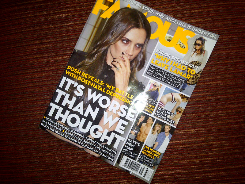 I was a bit torn at the check-out. I really wanted to know who Brad’s secret family were, despite commonsense telling me it wouldn’t be quite the dramatic revelation I was hoping for. But I wasn’t madly keen to read the other New Idea cover stories. Then I spotted Famous with Posh: It’s Worse Than We Thought, and I went “oooooh”. I hadn’t actually been aware things were bad, but it didn’t matter, because I could skip straight to worse. Posh looked dreadful and she was promising to tell me about her post-natal depression. Add Jessica Simpson calling her daughter Maxwell, Katy’s new man and that cute Aussie boy, Liam something-or-other, being caught in a love triangle, plus my favourite “mango” colour scheme, and I was hooked.