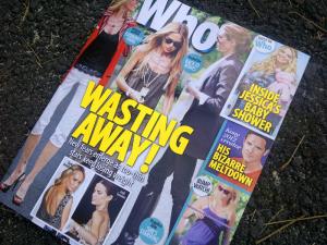 When I worked in magland, punters who said they read Marie Claire and WHO because they thought it was the clarsy thing to say – not because they actually did – annoyed the bejezus out of me. Stand up and be proud of your monthly/weekly mag fix, I say, no matter how trashy it may be. Magazines are about escapism, not impressing people. So, I really didn’t want to choose WHO again this week, I wanted to share the love. But I don’t give a flying f about My Kitchen Rules. Never watched an episode, have no idea who they are. Well, I have a vague idea who Manu is, but not enough to care about his love life. WHO, on the other hand, has trotted out that weekly magazine classic – celebrities who are WASTING AWAY. The pics are absolutely frickin’ awesome. Melanie Griffith’s bony chest and legs … lordy! Eat something woman or you’ll resemble an Egyptian mummy sans bandages. Ooops, too late, you already do. Rachel Zoe? Meh, she’s a nutter. But still, that’s some freaky ribcage action she’s got going on. At the other end of the spectrum, Jessica Simpson’s calorific mac ‘n cheese diet means she resembles the girl who turned into a blueberry in Charlie And The Chocolate Factory, without the blueness. My smuthounds of choice, Lainey Gossip, tell me Jess charged a motza for the baby shower pics, so I’m pretty keen to see if they’re worth the dosh. Congratulations, WHO, I’m so looking forward to snuggling up with you tonight.