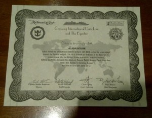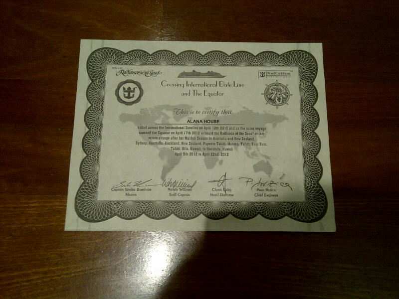 We crossed the Equator yesterday. There was a big ceremony. King Neptune attended. Passengers were voluntarily humiliated at his feet – commanded to get down on their knees and have spaghetti and tomato sauce thrown over them. Apparently it’s a traditional sailor-type activity, I’m assuming far more inappropriate hazing usually happens at sea. But this is a family ship. Bobby the cruise director explained that sailors who’ve already crossed the Equator are called trusty shellbacks, while newbies are called slimy pollywogs. Pollywogs must be “tested” to ensure they are tough enough to endure long, rough periods at sea. Men are strange creatures. I’m getting tired. This not lifting a finger caper is exhausting. I’ve been using the lifts instead of the stairs. I laze in bed until 8.30am every morning (it’d be later except for the nasty business of 9am boot camp). My lethargy extends to undie washing, cannot be shagged. I’ve coughed up another $25 to have someone else wash 26 pairs of dirty knickers for me. I rinsed out my own gym gear, though, as it requires hand-washing (the hide, after charging $80 for the leggings – they saw me coming) and was starting to reek. I’m feeling slightly nervous about my final bill at the end of the cruise. It’s a cashless ship, you just hand over your room card when you want something and they rack it up on your tab. Dangerous. The Threesome are up to $2200. Fark. $125 of it on washing. Threesome is hoping the husband wins a cash prize in the karaoke finals tonight to offset their debts. We’re shouting Threesome lots of champagne at dinner to offset our guilt over mirthing – new word, I made it up – them in The Blog. I’m not sure it will be enough. I may have to ask the ship’s priest about a hair shirt. In happier news, it’s only four days until we see Husband again. Hurrah! I made a $7-a-minute ship-to-shore call to him yesterday. Couldn’t hear a bloody thing, just intermittent “hello?” “hello?” noises. We’ve moved out of Tahiti satellite range and won’t pick up another until we near Hawaii. So if you don’t hear from me for a few days, you’ll know what’s happened. Fortunately I’ve heard Brad and Ange are engaged, would have hated to miss that anti-climactic bit of goss.Last night’s entertainment: piña coladas and a ventriloquist telling sex jokes. Sprog 1 rates it the second best show of the cruise after the hypnotist. She wants his DVD. She’s not getting it (I’m also hoping she didn’t get it) (ah, those Bill Clinton drycleaning jokes, they never get tired).