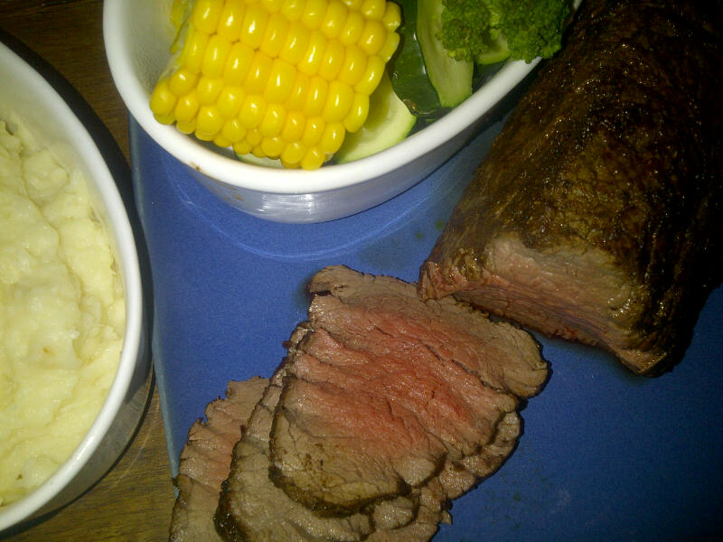 Husband “won” a gourmet hamper at the last school fundraiser and I’ve been trying to clear out the contents before they expire (which is what usually happens to all the odds and ends in my gourmet hampers). This week’s clearance item: Spice & Co Australian BBQ Spice Mix. Inspired by a delicious beef fillet Husband’s brother cooked for Xmas a few years ago, I decided to rub one with the spice mix then roast it. The results were melt-in-the-mouth tender, even fusspot “it’s chewy” Sprog 2 pronounced it delicious and asked for seconds. Parnsips aren’t to everyone’s taste, but I find if you boil ’em long enough, then mix ’em with enough cream and salt they can be quite palatable. They’re carb-free too, as opposed to potatoes. Since Sprog 2 cares nothing for the lack of carbs in her side dishes, I made her some mashed potato instead. Sprog 1 doesn’t eat mashed anything and requested cous cous next time to pad the meal out. Beef fillets aren’t cheap, but I had enough left over to make beef fritters the next night for our dinner. Recipe for fritters to follow tomorrow.