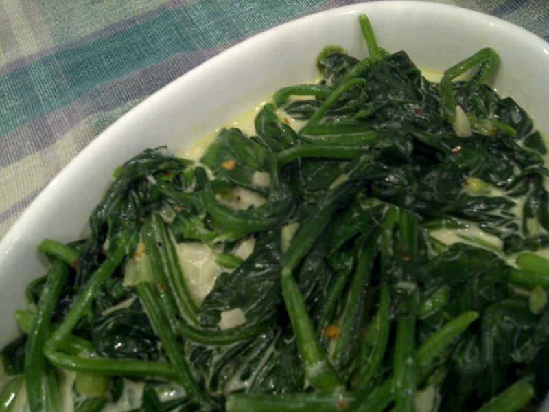 INGREDIENTS: 1 bunch English spinach (thoroughly washed, nothing worse than gritty bits in your creamed spinach, says the voice of experience), 1 chopped garlic clove, 2 chopped green onions, 1 tablespoon olive oil, pinch of nutmeg, pinch of salt, 1/4 cup cream, 1 tsp lemon juice.