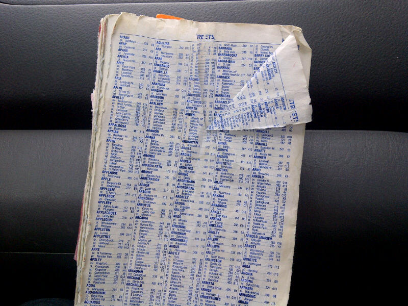 I drove to Mortdale earlier this week to visit a friend. I had no idea where Mortdale was – other than south – so I consulted my street directory. My street directory is an ancient, decrepit thing, missing its first 10 pages, including most of the “A” entries. Fortunately my friend’s street started with an R. I drove to Mortdale clutching my street directory in one hand and the steering wheel in the other. I got terribly lost. I kept pulling over to the side of the road, turning the street directory around and around hoping to make sense of it. The trip to Mortdale took 60 minutes. I believe it should only take 30-40 minutes. When I arrived, I apologised to my friend and explained I had trouble finding my way with my Gregory’s. And she was like: “Your what?” And I said, “You know, my street directory.” She laughed. She said people don’t use street directories any more, they don’t even print them these days.* A wave of panic swept over me. I made a mental note check eBay the moment I got home to see if it had them. (I can just see myself in 20 years time, hustling around antique book shops, snatching street directories out of marvelling youths’ hands and marching to the counter to pay $150 for them.) My friend asked if I had a GPS in my the car. No. She asked if I had a GPS-style function on my mobile phone. I said I didn’t think so. She smiled at me kindly, like I was a disoriented grannie she was helping at the local shops. I love my street directory. I’m gutted that they don’t make them anymore. I’ll be lost without one. Granted, I tend to be lost with one. But it comforts me to turn the pages. I love pages. People keep taking all the pages out of the world. It makes me sad.