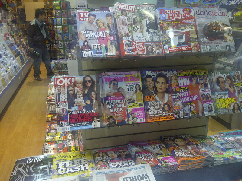 I’m always fascinated by how differently two magazine editors can treat the same story. Here are the current covers of People and WHO, revealing how Tom Cruise is coping with losing his wife and primary custody of his daughter in 11 short days. The pair are sister publications (People is published in the US) so the stories inside will be pretty similar, but I reckon WHO knocks it out of the park with its emotive coverline: “Tom at breaking point”. And the photo of Tom carrying Suri is far more appealing than a close-up of Tom’s sad eyes and the coverline “Tom’s shattered world” in my book. I know which one I’d be buying if I had to choose at a newsstand.
