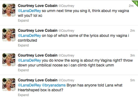 Lana Del Rey sang a cover of the Nirvana song Heart-shaped Box during her recent Sydney concert. When Courtney Love heard about it she started bombarding Lana with – unanswered – tweets explaining the song was about her vagina (ooops, I’m not supposed to say that word, sorry).