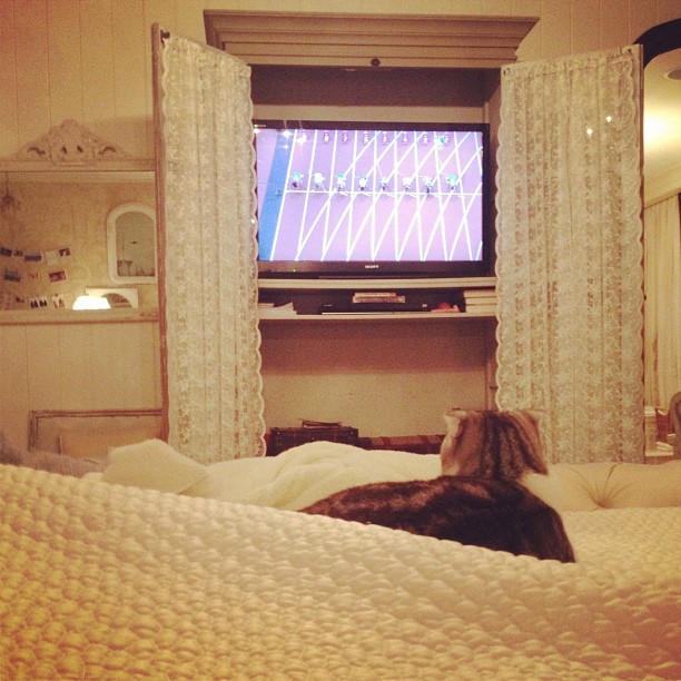 * “She’s actually watching the Olympics” says Taylor Swift of her cat (above), but the thing that fascinates me more is that Taylor still has my cliched idea of an American teenager’s bedroom, cute!