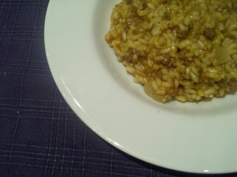 (I can never work out how to photograph risotto, but I’ve given it my best shot. Some fresh herbs sprinkled on top might have helped, but I didn’t have any. At least it doesn’t look as scary as the Beetroot Risotto I made a few weeks ago.)
