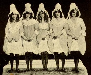 According to Wikipedia: “In their most famous act, the sisters would dance, raising their skirts slightly above their knees, and ask the audience, “Would you like to see my pussy?” When they had coaxed the audience into an enthusiastic response, they would raise up their skirts, revealing that each sister was wearing underwear of their own manufacture that had a live kitten secured over the crotch.” (See entertaining pic above.)