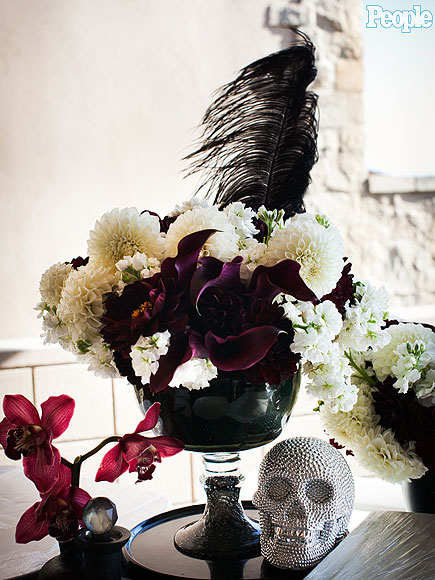 “Keeping in line with the heaven and hell themes, vases of purple orchids and white blooms (along with rhinestone skulls) serve as the décor centerpieces scattered throughout the soirée.”