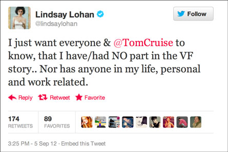 * Lindsay Lohan denies via Twitter that she blabbed to Vanity Fair about Tom Cruise interviewing her as a potential sci-wife. She possibly should have read the VF article first, as it apparently doesn’t mention her.