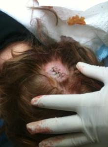 The wound was far more impressive the other night, an enormous purple egg with an edge-of-fence dent in it. Sprog 1 was far less stoic than when she split her head open to the bone a few months ago, because she knew what the consequences might be – a 70-year-old doctor fumbling to remember how to do stitches and poking his fingers around in the wound/trimming the edges with some surgical scissors. As documented in Shut Up You Mental Patient. Shudder.