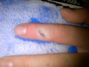 So of course I decided I’d blog about it after realizing I had graphic images of Sprog 1’s previous injuries, including the finger she shut into the car door. Like door totally shut. And me just staring in frozen horror and seconds passing before reacting. Like when people rush for the losing elevator doors and you forget where the “doors open” button is and they slam shut in their face.