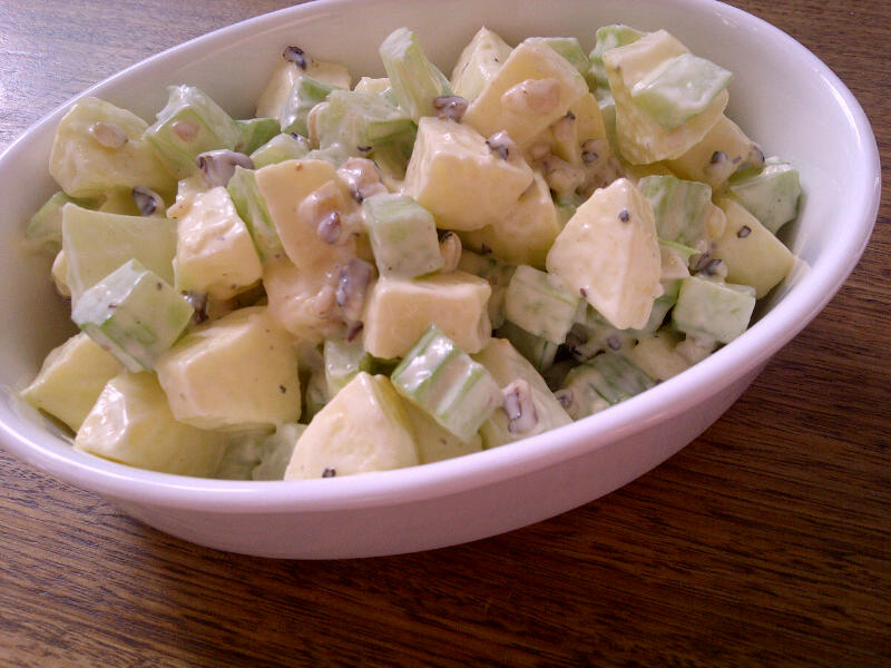 Waldorf Salad has always sounded a bit yerk to me: apple, celery, walnuts and mayonnaise mixed together. Just. Not. Right. But I had some excess celery, apples and walnuts in the fridge prior to my Newcastle visit so I gave it a whirl. Mum was promising to have a barbecued chicken and bread rolls waiting on our arrival and I thought I’d take an edible gift to accompany lunch.