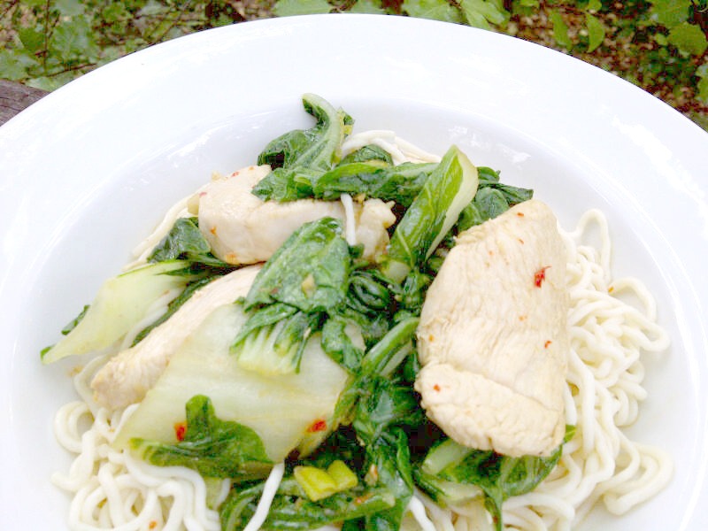 Method: Stir-fry garlic, ginger and shallots until softened. Add chicken and stir-fry one minute. Add bok choy and stir-fry until just wilted. Add stock, soy, sambal oelek, lime juice and bring to boil. Toss through noodles. Serves 2.