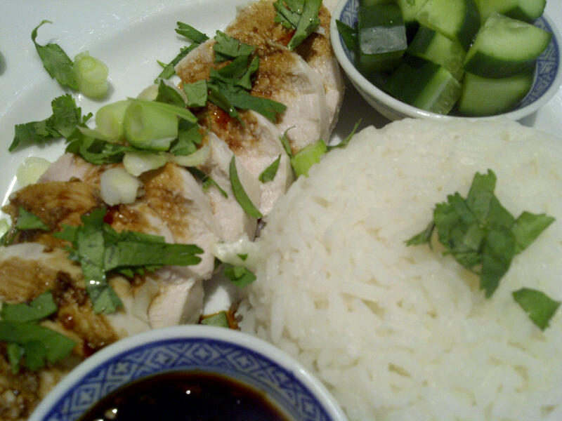 When I lived in Singapore I was hooked on a dish called Hainanese chicken rice. Poached chicken, a spicy dipping sauce, a few rings of cucumber and rice cooked in chicken stock (or, more likely, fat – how else could it taste so good?). Such a simple dish but brimming with flavour.