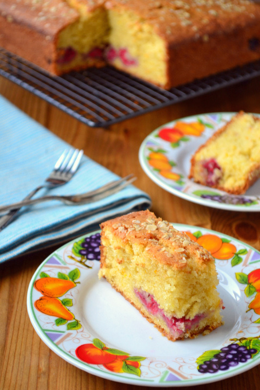 Method: Preheat oven to 180C and grease a square cake tin (22x22cm). Cream together the butter and sugar, beat in the eggs one by one and gently fold in the zest, juice and flour. Pour roughly half the batter into the prepared tin, scatter the raspberries over the top and then cover with the remaining mixture. Sprinkle over a few oats and pop in the oven to bake for 45-55 minutes – it is cooked when brown and a knife emerges clean from its depths. Leave to cool for 10 minutes before turning out.
