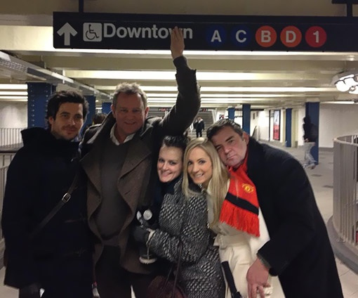 The cast of Downton Abbey visited New York and posed under a “downtown” sign for the New York City subway, with the “w” appropriately covered.