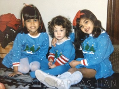 Kim Kardashian went retro with this childhood snap: “Nothing says ‘Christmas Eve’ like sisters in matching Christmas tree dresses!”