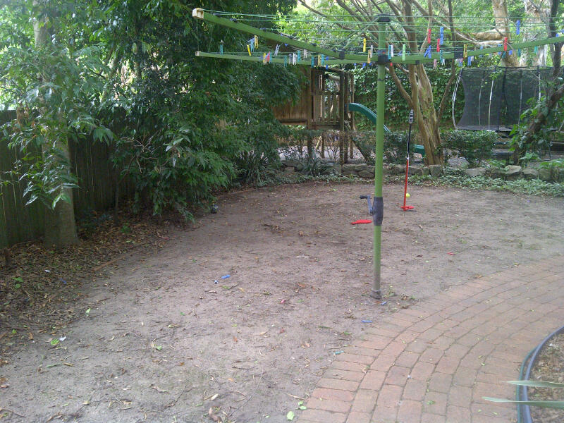 Yes, yes, I know real grass would be much nicer, but I’ve tried laying the stuff twice and it carked it both times. I’m also thinking I’d remove the low-lying greenery and rocks between the baked earth and the play equipment and run the fake grass straight through.