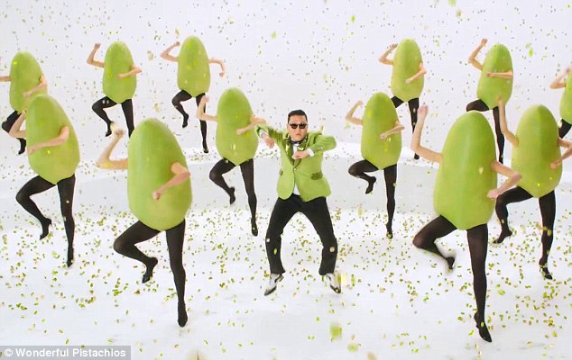 The Korean singer begins by breaking out of a pistachio shell to the words “crackin’ Gangnam style”, then has a dance battle with a life-size versions of the nuts.