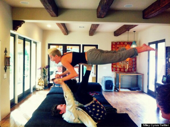 Miley Cyrus has shared a photograph of herself goofing around with a friend on Twitter, captioned: “Superman dat hoe! Woahhhhhh!!!!! ✈✈✈”