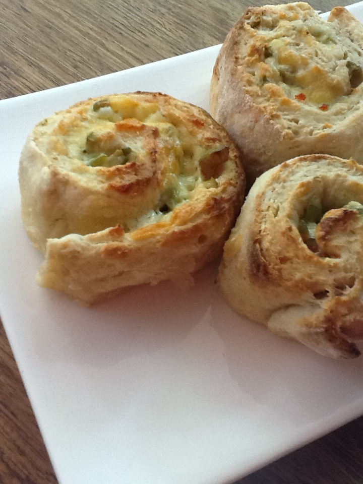 METHOD: Preheat oven to 220C. Rub butter through flour. Stir in milk to make soft dough. Knead gently on a lightly floured surface, and then roll to form a 40 cm x 25 cm rectangle. Sprinkle olives and cheese over dough. Roll up along the long side to enclose the cheese. Cut 10 x 4cm pieces from the roll and place close together, cut side up on a greased baking tray. Bake for 15-20 minutes or until cooked and golden.