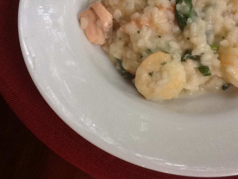 METHOD: Heat oil in a heavy-based pan. Saute prawns and salmon until prawns are just pink. Remove to plate. Add a little more olive oil. Saute onion and garlic until soft. Add arborio rice and saute 1 minute. Add white wine, stir until evaporated. Add chicken stock 1/2 a cup at a time, stirring continuously until absorbed. When rice is just tender, wilt spinach into it. Stir in cream and seafood gently. Toss with parmesan and serve.