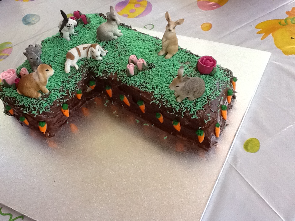 But the bunny cake was a hit. A cinch too: a plain sponge from Woolies cut into a 7, iced with some Betty Crocker ready-made, scattered with green sprinkles and icing roses, with some cake-decorating shop-bought icing carrots around the edges and 7 plastic bunnies on top. Voila!