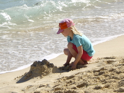 So was Sprog 2, until she got entangled in Sprog 1’s long legs and went under. Much wailing ensued and she retreated to the sand, where she insisted I build sandcastles with her. Hurrah. I’m not a sand-under-the-fingernails kind of gal. I’m not a beach girl generally. All I can think about is how the sun is burning my delicate, redheaded skin to a crisp.