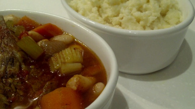 METHOD: Add a few sploshes of olive oil to a heavy based pan. When oil is hot, pan-fry veal shins until brown. Place in a slow-cooker. Add a dash more oil to the pan and saute onions and garlic until soft. Add to slow-cooker. Add carrots, celery, stock, wine and passata to the slow-cooker. Cook for 8 hours on low. Serve with celeriac puree (a low-carb alternative to potatoes) and gremolata (a delicious topping that really amps up the flavour, optional)