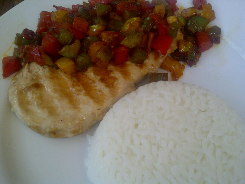 METHOD: Toss chicken fillets in oil, soy, ginger and garlic. Marinate 2 hours. Reserve marinade. Grill fillets until no longer pink. Spicy capsicum sauce: heat oil in a heavy-based frying pan and saute capsicum and shallots until tender. Scrape in remains of chicken marinade, add chilli bean sauce, soy and tomato paste. Stir-fry 1 minute and serve with chicken, steamed rice and veggies.