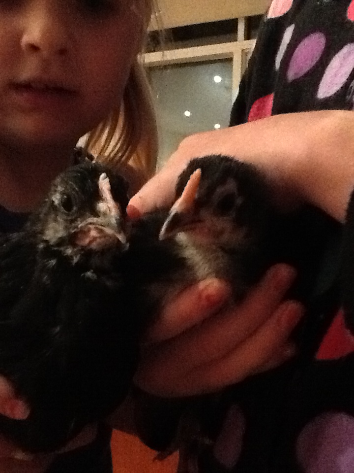 Bunny doo-doo doesn’t smell, but chick shite does so it’s pretty smelly having chicks inside the house … they do big sloppy ones everywhere, then stand in them and trek their poopy feet all over my floorboards … but they are so adorable that I forgive them. They love climbing onto the girls arms to roost. Awwwww.