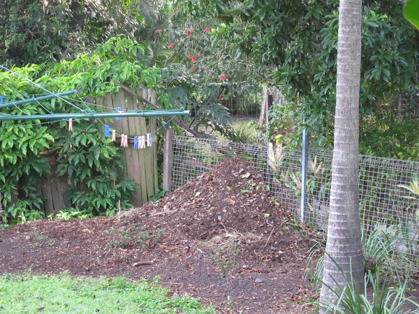 But things took an ugly turn in my relationship with the brush turkey family when I discovered them building a nest in our backyard. We have a long, 5m wide strip of concrete along the back fence and it is now covered in all the top soil and tan bark from our garden. Totally covered. With a big pile against the fence. And no matter how many times we remove it, it returns the next day. Backyard Armageddon.