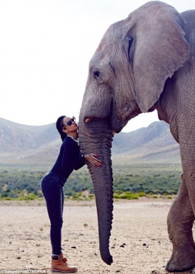 She posed with a baby giraffe while visiting an animal sanctuary in Johannesburg and embraced an enormous elephant, captioning the shot ‘Mama Africa #safari’.