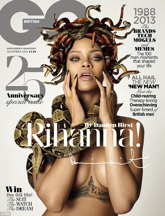 Rihanna has posed topless with snakes wrapped around her body for the cover of British GQ’s 25th anniversary issue.
