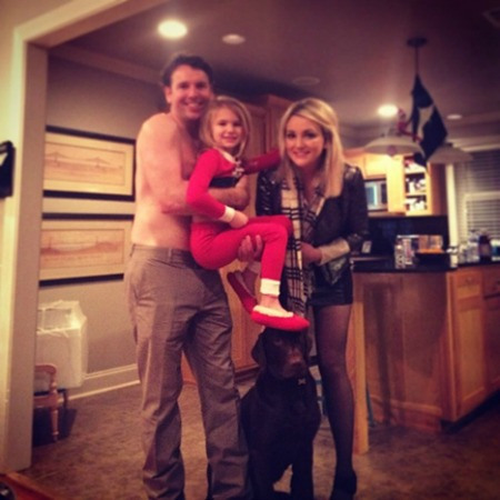 Britney Spears’ 22-year-old sister, fellow singer Jamie Lynn, posted a pic on Instagram of her fiance, Jamie Watson, 5-year-old daughter Maddie, and their chocolate labrador, Nice. She captioned it: “Attempting a family photo.”