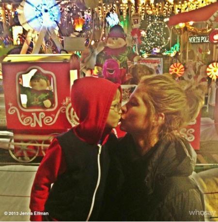 Jenna Elfman and her son Story, 6, celebrate Christmas with a kiss. She captioned it “Holiday Love” on Instagram.