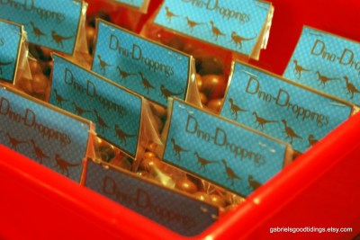 >> Then send everyone home with a bag of dinosaur droppings! Think chocolate covered sultanas and other lumpy choc treats. Idea from Gabriel’s Good Tidings.
