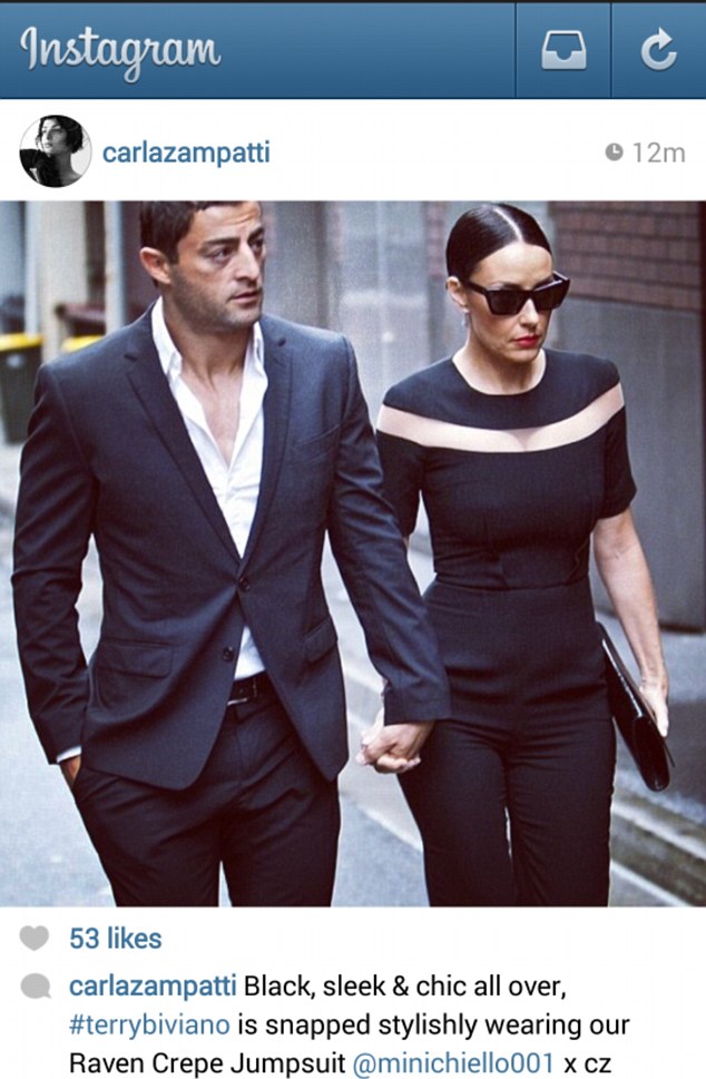 >>Designer brand Carla Zampatti issued an apology after useing a picture of grieving Terry Biviano at Charlotte Dawson‘s memorial to promote the label on Instagram on Tuesday, captioned: ‘Black, sleek & chic all over, #terrybiviano is snapped stylishly wearing out Raven Crepe Jumpsuit @minichiello001.’