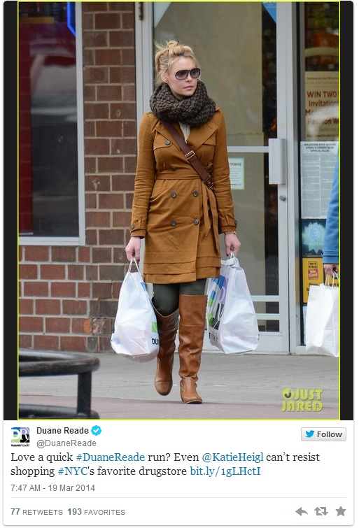 >> Former Grey’s Anatomy star Katherine Heigl, is suing New York pharmacy chain Duane Reade after they tweeted a papparrazi photo of her leaving one of their stores. Heigl is demanding six million dollars in compensation for “false advertising”.