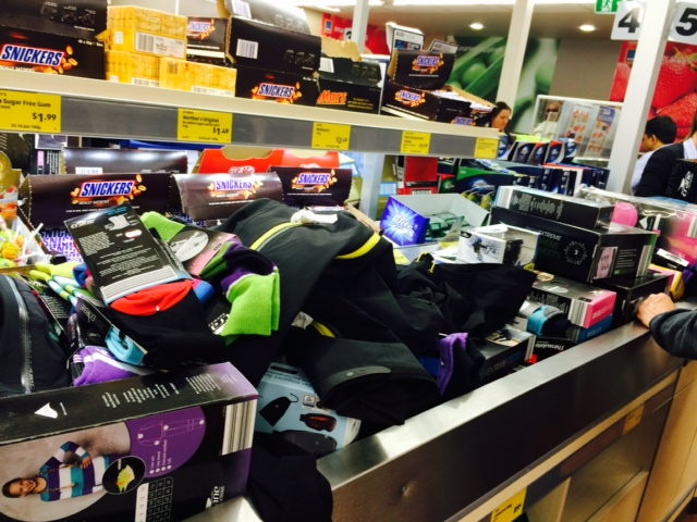 The queue was already about 50 deep when we arrived. Within 10 minutes it snaked through the shopping centre. The eldest was charged with wheeling/guarding the trolley, while I bolted through the aisles to ski nirvana in the centre of the store.