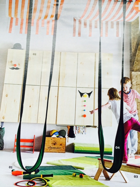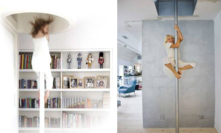 We’ve settled on something with a vaguely junior Pamela Andersonesque vibe (that sounds a little disturbing, I know, but bear with me): a trapeze above the bed and a fireman’s pole in the corner that leads from an attic playroom above … Oh, and a swing and a balance beam and lots of gym mats.
