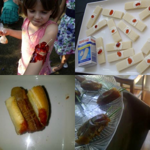 The food: wafer Band-aids; severed finger sausage rolls; stuffed date “bugs”; tombstone cupcakes.