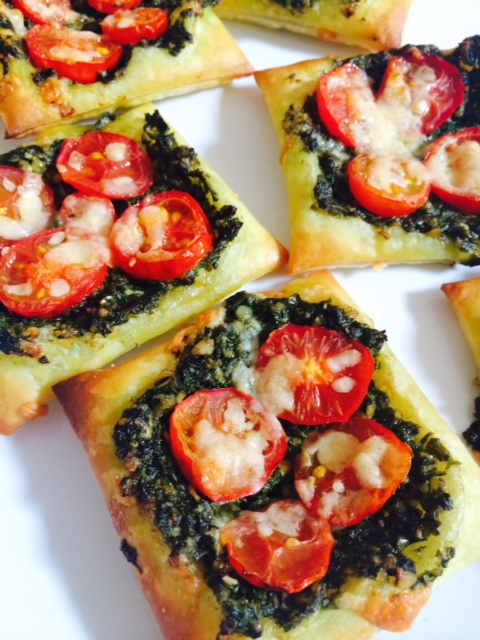 METHOD: Defrost puff pastry and cut each sheet into 9 squares. Spread generously with pesto, leaving 1/2cm around the edge. Arrange tomato slices on top, sprinkle with parmesan. Bake at 200C until golden.