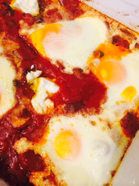 METHOD: Preheat oven to 180C. Heat generous slug of oil in a heavy-based frying pan. Add onion, capsicum and chorizo and saute until vegetables are soft. Add garlic and spices and cook for two more minutes. Pour passata into pan and bring to boil. Transfer to baking dish. Crack eggs into mixture. Season with salt and pepper. Bake in oven for 20 minutes or until egg whites are just cooked. Serve with dollops of goat’s cheese on top (if liked – I looooove) and dip Turkish toast into the mixture to gorge.