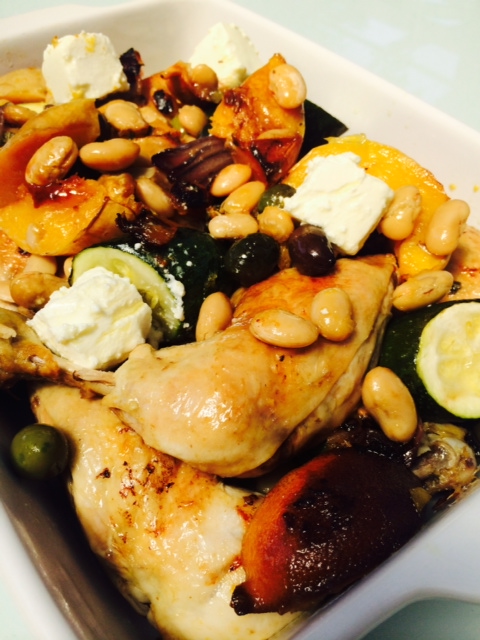 METHOD: Preheat oven to 200C. Put chicken, pumpkin, lemon and onion into a roasting pan. Mix olive oil, salt, sage and garlic. Drizzle over roasting pan and toss to coat. Roast until 40 minutes. Add zucchini, olives and butter beans and gently toss with other ingredients. Roast until chicken golden and zucchini cooked. Top with goat’s cheese. Serve.