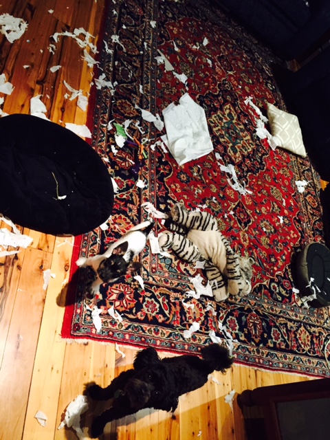 OK, so he left this mess for me to clean up (toilet paper and puppies are a baaaaad combination) …