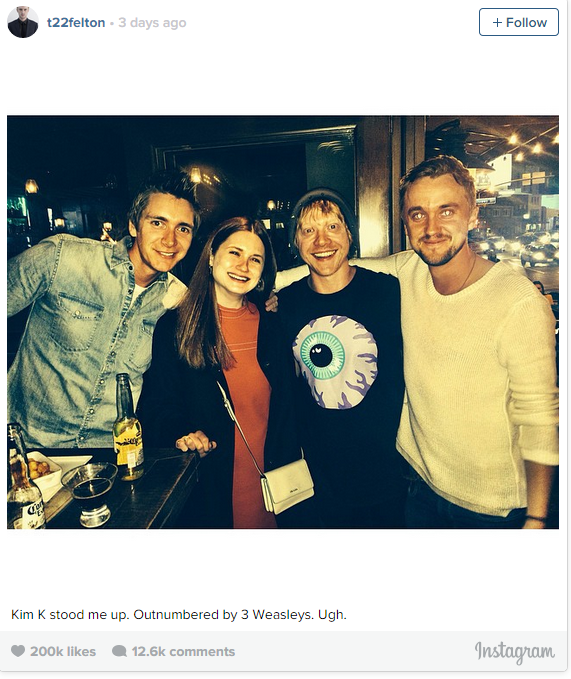 >> Draco Malfoy was hanging out with the Weasleys in West Hollywood recently … imagine the double take you’d do if you walked into a bar and spotted this mob …